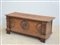 Cassapanca in noce con montanti intagliati a motivi vegetali, fronte decorato con rosone centrale (cm 133x55x49)(difetti)