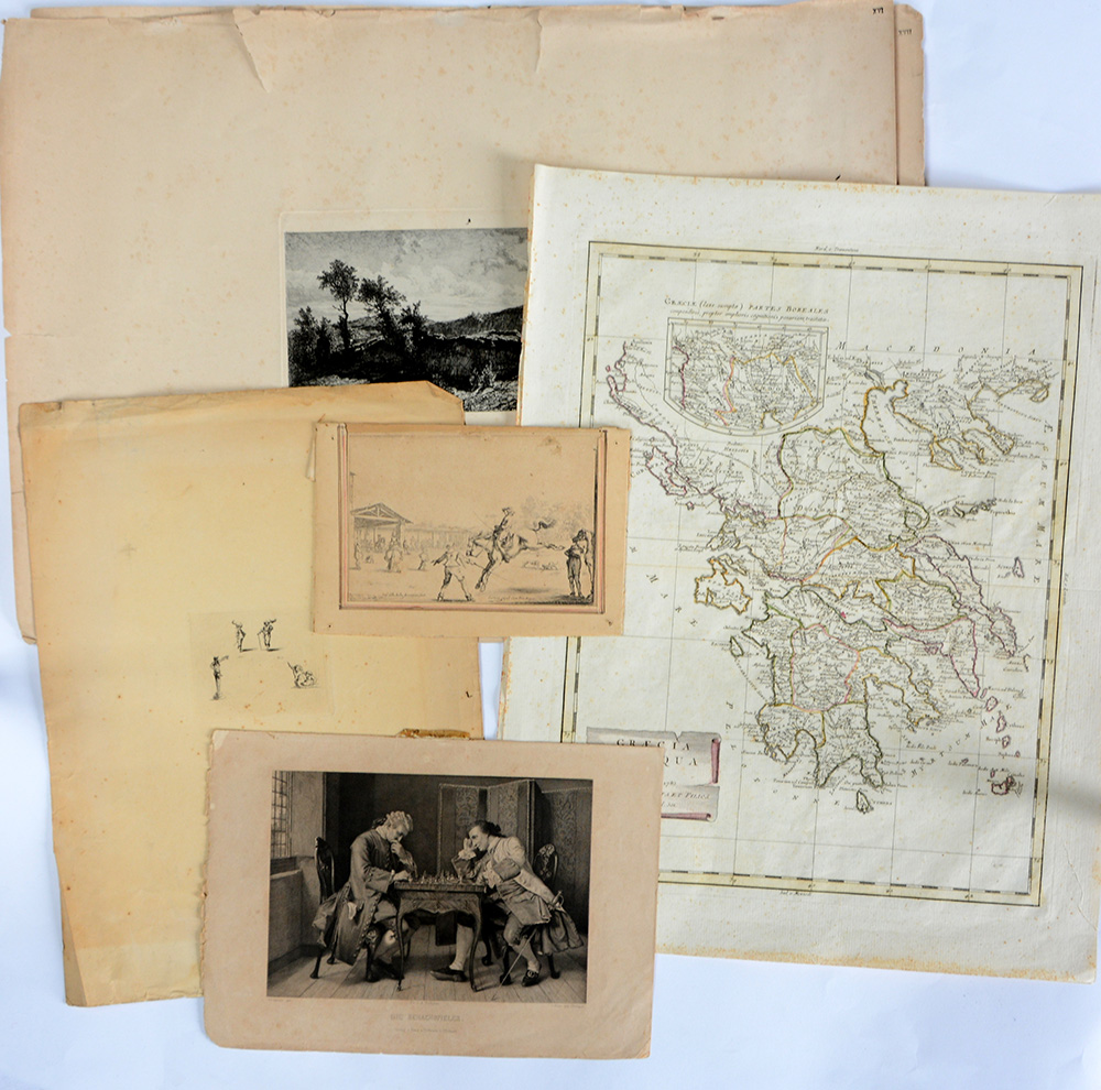 Lotto di sette stampe diverse tra cui due carte geografiche del secolo XVIII di Antonio Zatta inerenti la Grecia e l'Egitto (difetti)