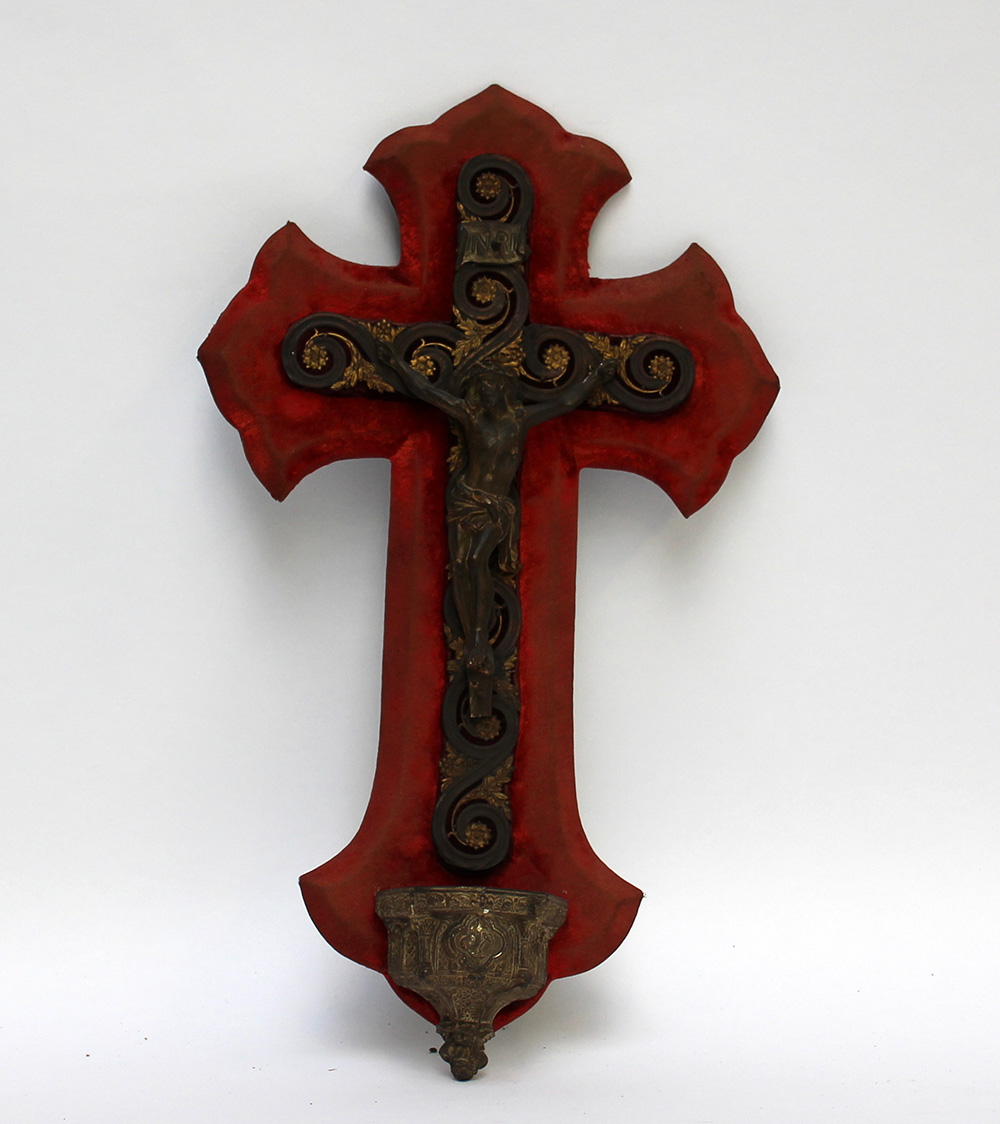 Arte della seconda metà del secolo XIX "Cristo crocifisso" scultura in bronzo dorato su croce decorata a girali e motivi floreali. Alla base acquasantiera con formella centrale e arcate (h. tot cm 43,5)