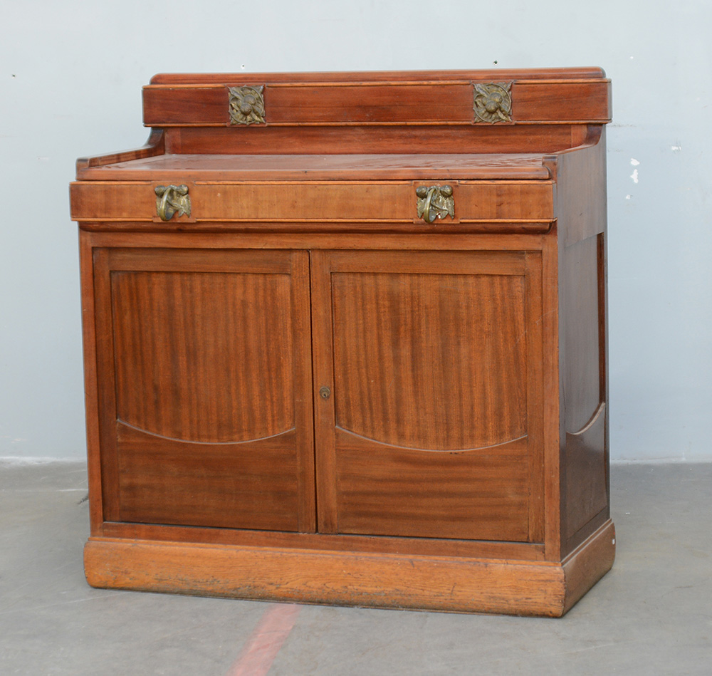 Piccola contro-credenza liberty con corpo a due ante e un cassetto. Milano, 1905ca. Struttura in legno di rovere, lastronatura in mogano biondo, maniglie in fusione di bronzo. (cm 112,5x114,5x48,5) (lievi difetti)