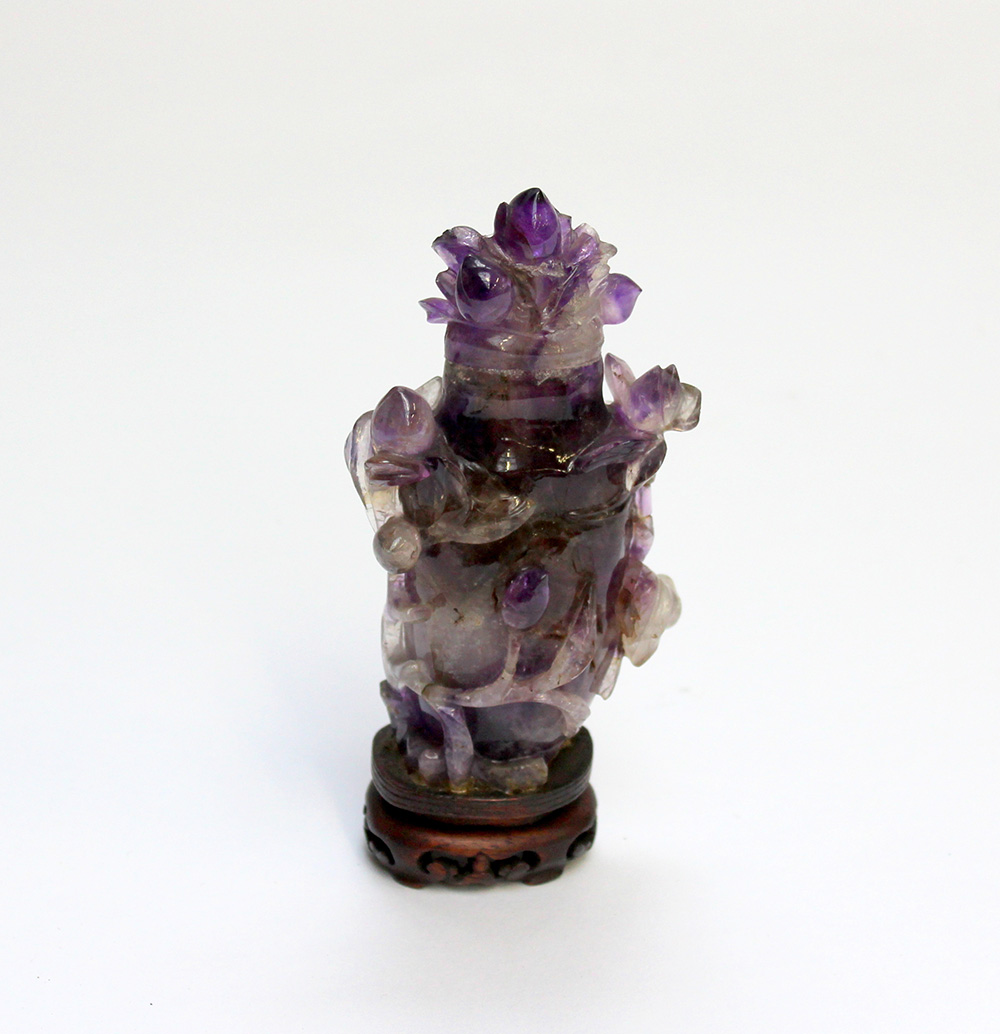 Piccolo vaso con coperchio in quarzo viola, base in legno (h. max cm 12) (difetti)