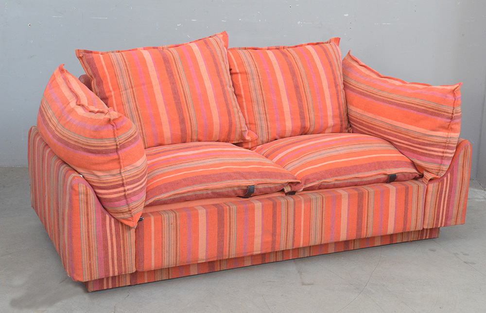 Divano imbottito con struttura in legno e metallo in tessuto a righe policrome nei toni del rosso. Italia, anni '70. (Difetti e piccole mancanze)