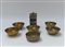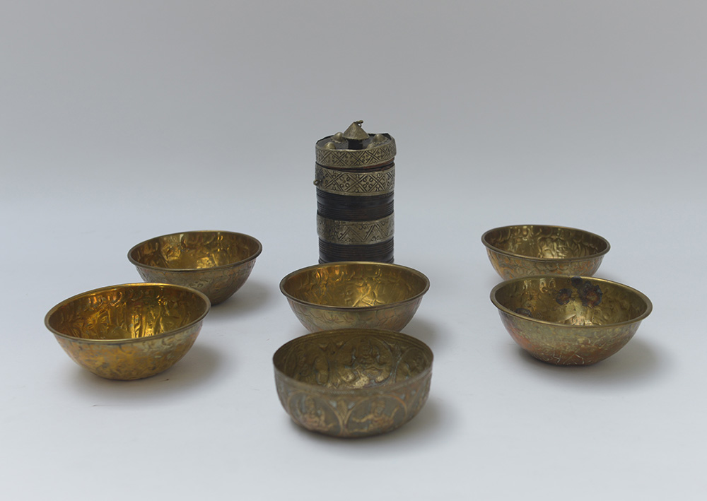 Manifattura orientale, lotto composto da sei ciotole in rame sbalzato ed un contenitore con coperchio in legno e metallo (difetti)