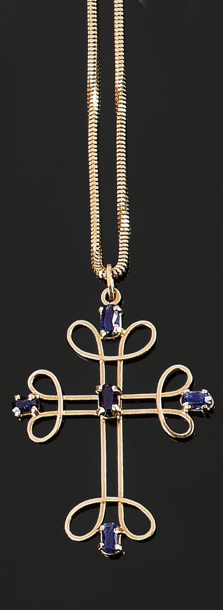 CATENA CON CIONDOLO Catena in oro giallo, motivo detto a "coda di topo", con ciondolo pendente a forma di croce e cinque zaffiri taglio ovale Peso gr. 13,5