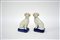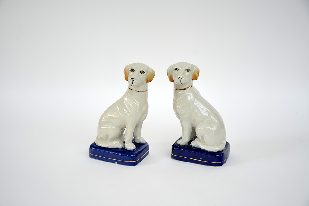 Coppia di sculture in porcellana raffiguranti cani assisi decorati in policromia