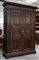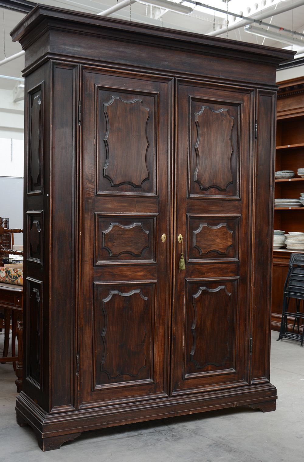 Armadio in pioppo a tinta scura con sportelli e fianchi bugnati, anta interna...