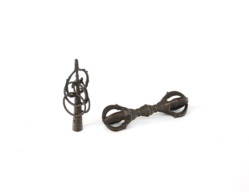 Lot 134 | Vajra ed elemento decorativo in bronzo con anelli. Manifattura orientale,...