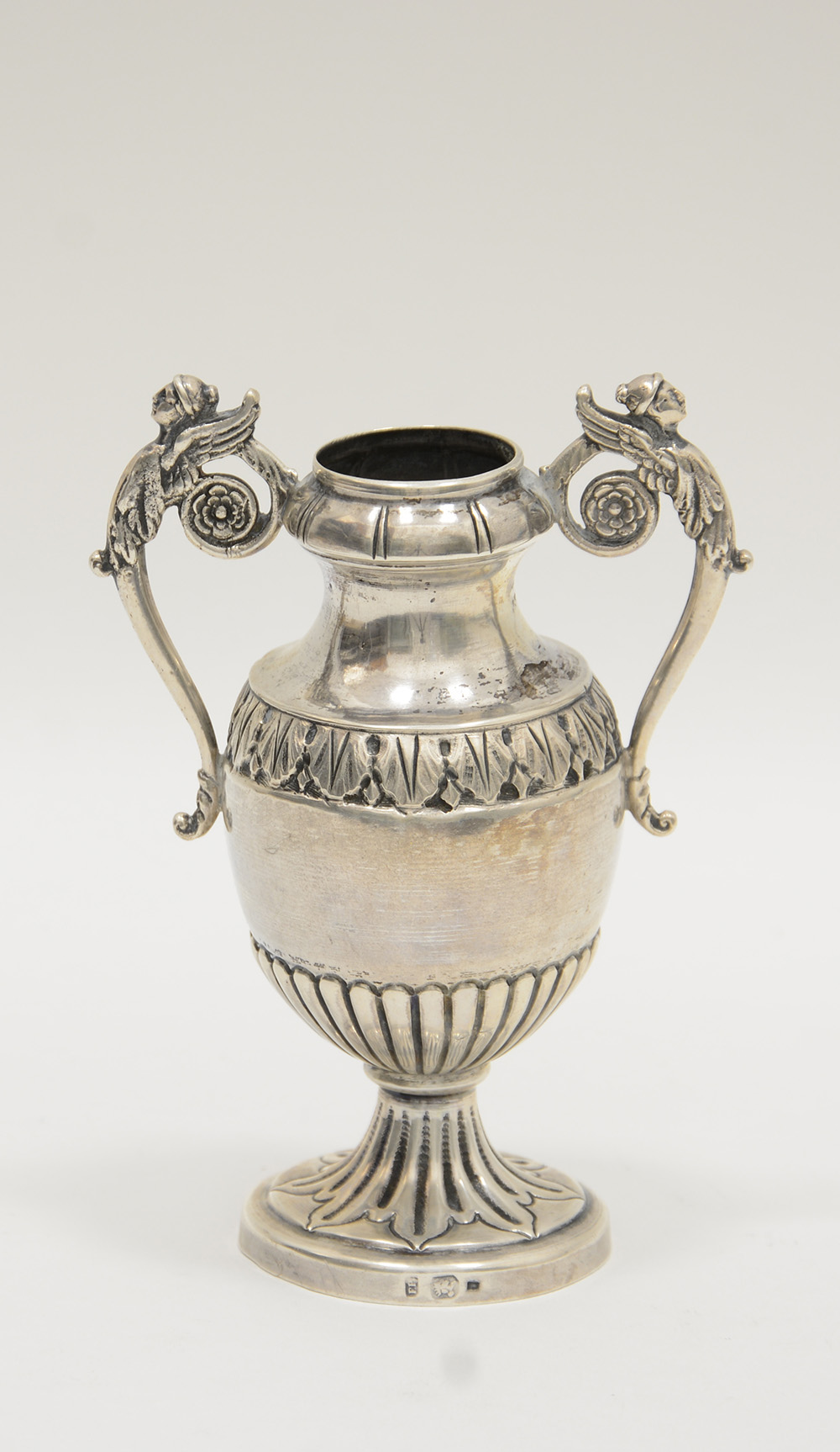 Vasetto in argento con corpo ovoidale decorato da baccellature e cinture fogliate, prese a figura di polena. Manifattura italiana, inizio secolo XX (h. cm 14) (g 180 ca.) (lievi difetti)