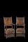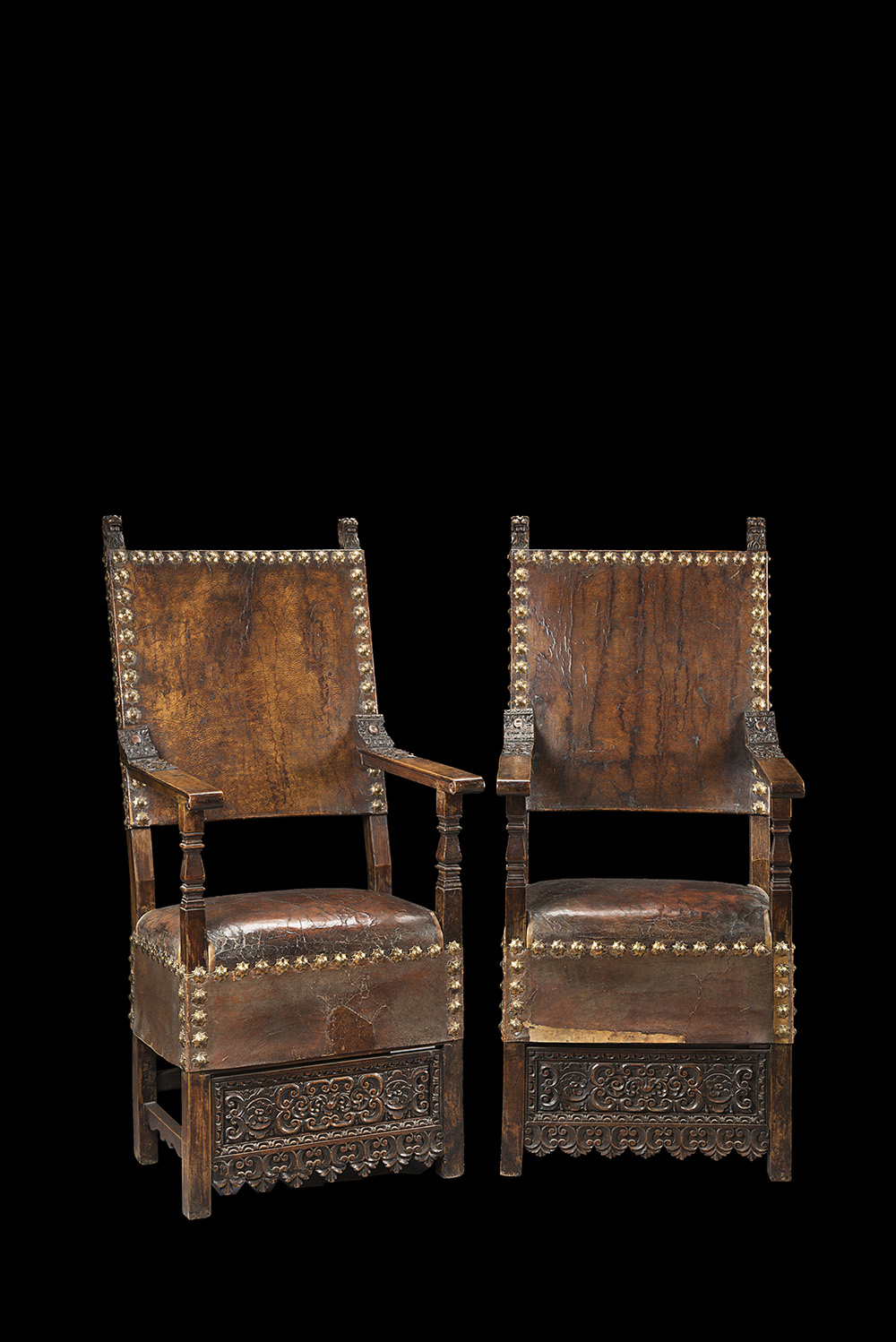 Coppia di seggioloni in noce con puntali intagliati a teste leonine. Gambe dritte unite da pannello scolpito a motivi stilizzati. Sedute e schienali in cuoio. Secolo XVI (difetti)