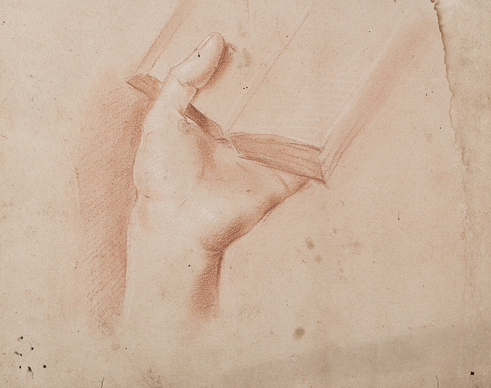 Artista del secolo XVIII "Studio di mano con libro" matita rossa e gessetto...