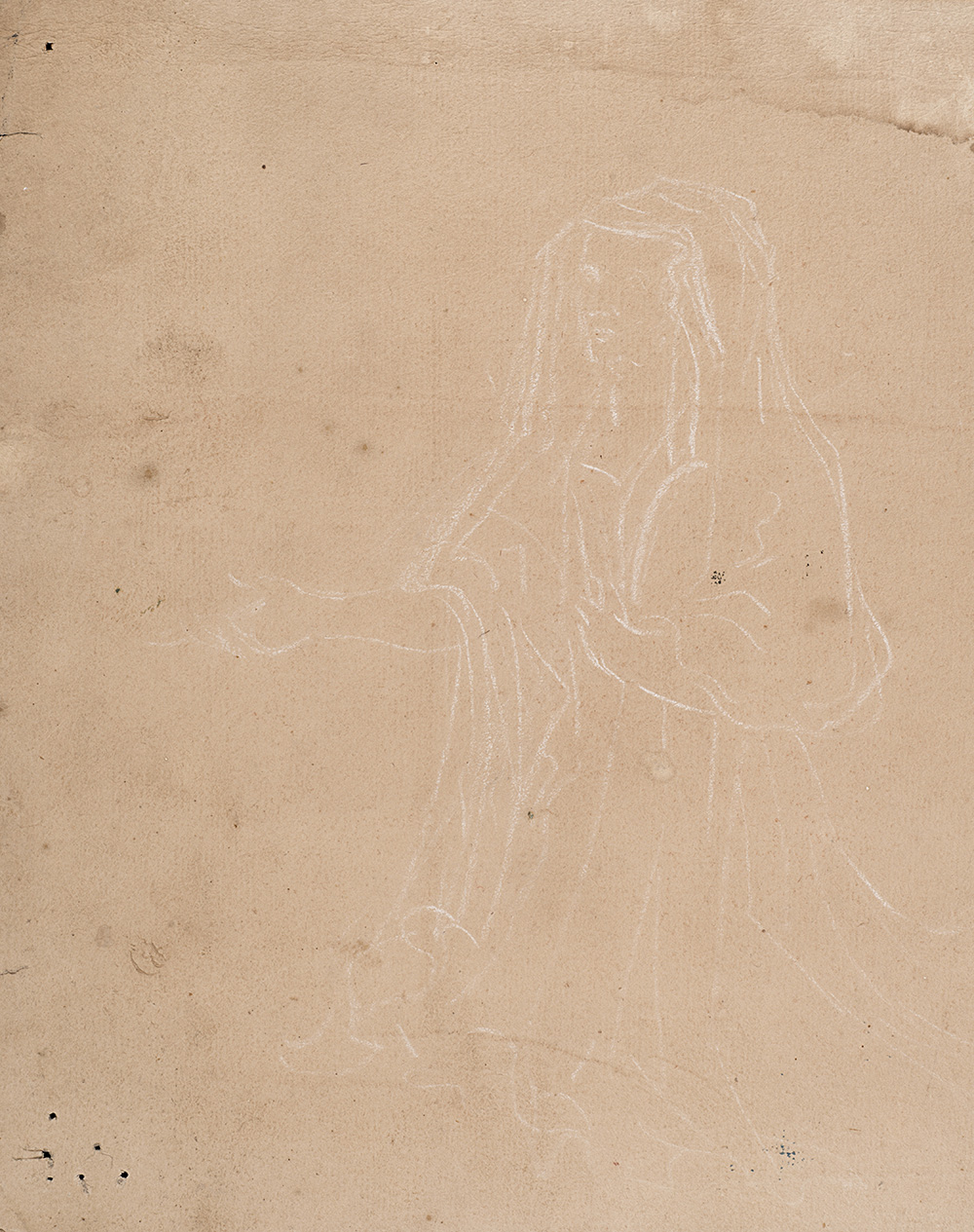 Artista del secolo XVIII "Studio di mano con libro" matita rossa e gessetto bianco (recto); "Figura di santa" gessetto bianco (verso) su carta (mm 266x215) (difetti)