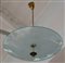 Pietro Chiesa (1892-1948) (attribuito)- Lampada a sospensione. Probabile produzione Fontana Arte , anni 30. Struttura in ottone e alluminio laccato bianco, paralume formato da un disco in cristallo satinato accoppiato a una grande coppa in cristallo trasparente azzurrino, decorata sulla superficie interna con foglie d'acanto incise a getto di sabbia (d cm 60, h cm 70) (difetti)