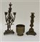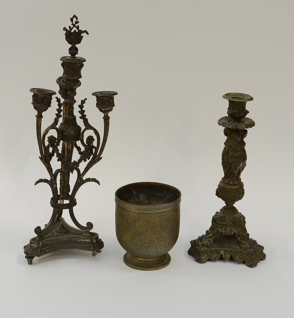 Lotto composto da due candelieri decoratri in rilievo ed un mortaio in ottone e metallo patinato, misure diverse (difetti)