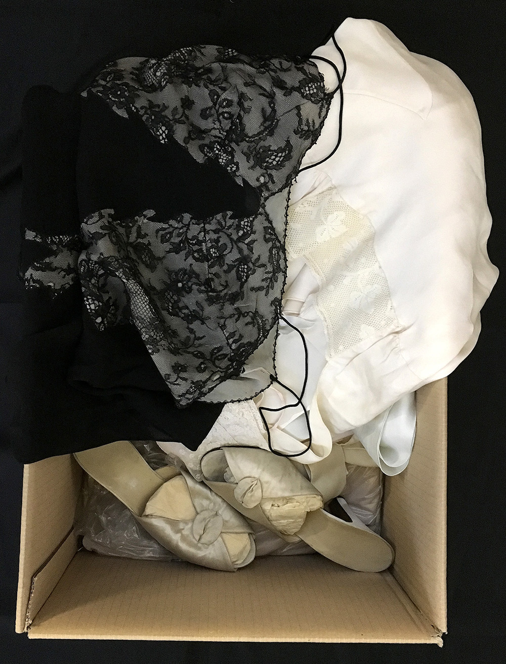 Cartone di biancheria intima decorata con pizzi vari uniti ad un paio di pantofole con tacco in raso d'epoca (difetti)