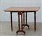 Tavolino ad alette lastronato in radica con gambe tornite poggianti su piedi sagomati muniti di rotelle. Fine sec. XIX (cm 84x71x16)