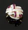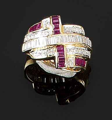 ANELLO Anello in oro giallo, a fascia, con file intrecciate di diamanti taglio brillante rotondo e baguette per complessivi ct 1,30 ca e rubini taglio carré Peso gr. 7,3 Misura 15