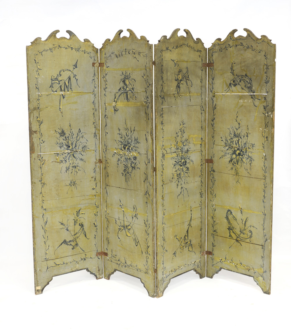 Paravento a quattro ante in legno laccato a monocromia e paesaggi con scene di vita e figure orientali. Veneto, sec. XVIII (cm 170x200) (difetti e restauri)