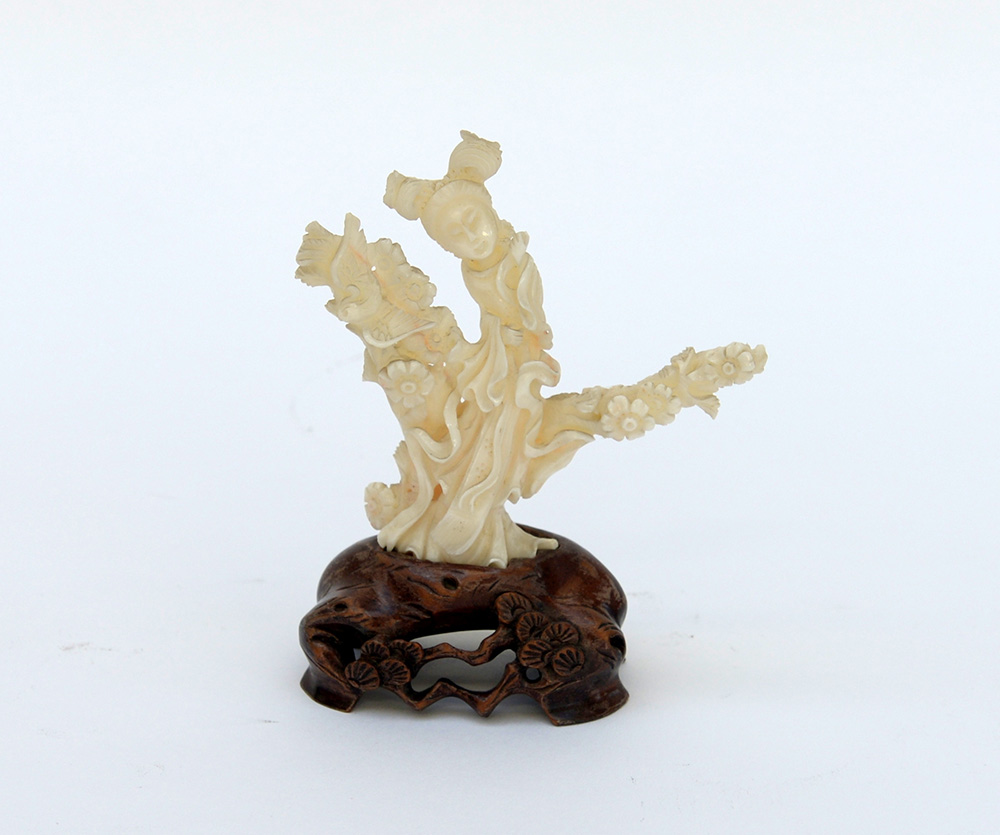 Piccola scultura in corallo trattato raffigurante donna tra rami in fiore, su base in legno (h tot cm 14)(difetti e mancanze)