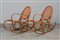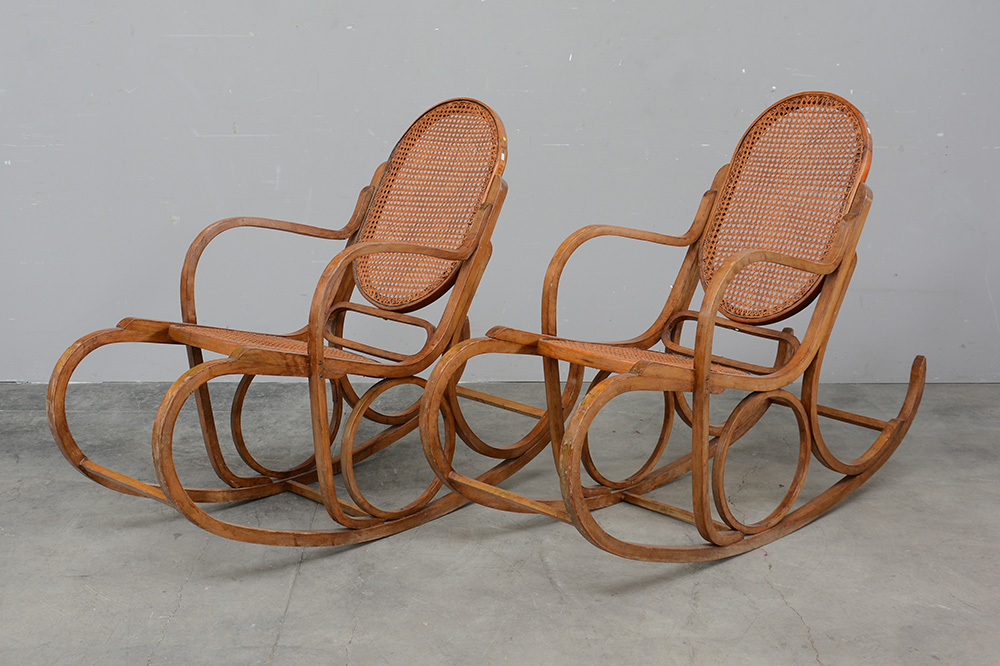 Coppia di sedie a dondolo. Produzione centro europea, prima metà secolo XX. Faggio curvato con seduta e schienale in paglia di Vienna. (cm 136x102x46) (lievi difetti e restauri)