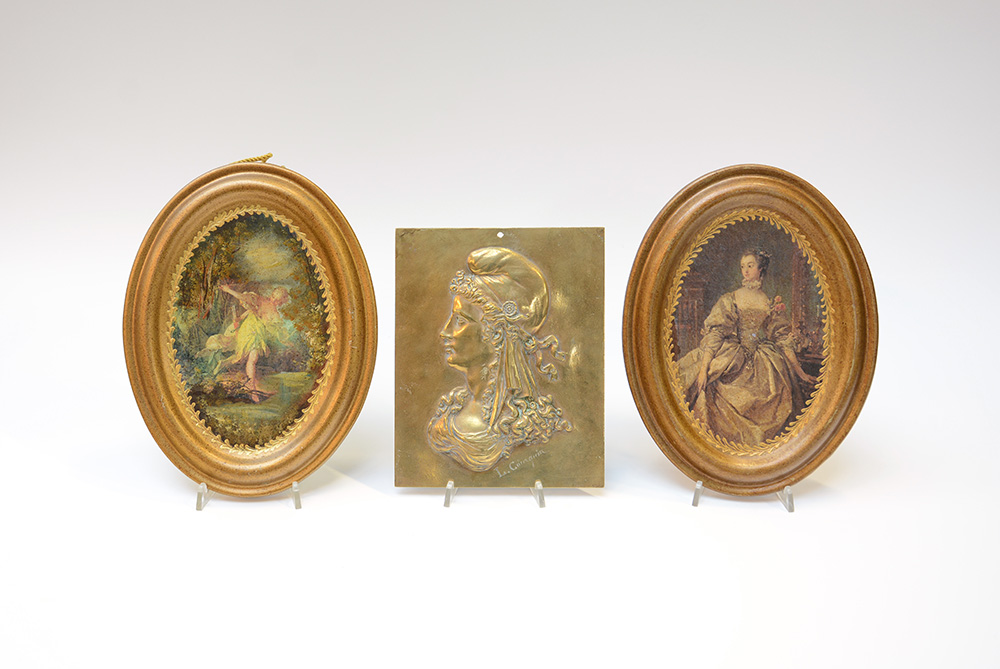 Lotto composto da due ovali in ceramica dipinta raffiguranti personaggi femminili e una placca in bronzo con profilo di nobildonna (lievi difetti)