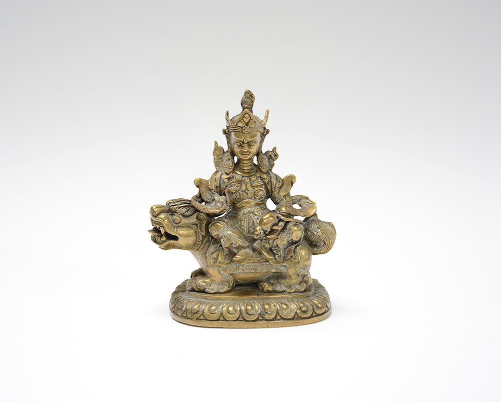 Scultura in bronzo raffigurante divinità seduta su un leone (lievi difetti)