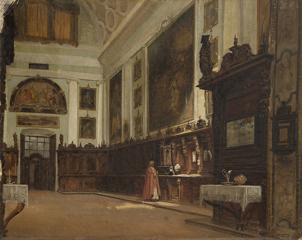 "Interno di sacrestia" 1859, olio su cartone (cm 37x47) Firmato e datato in basso a destra. In cornice