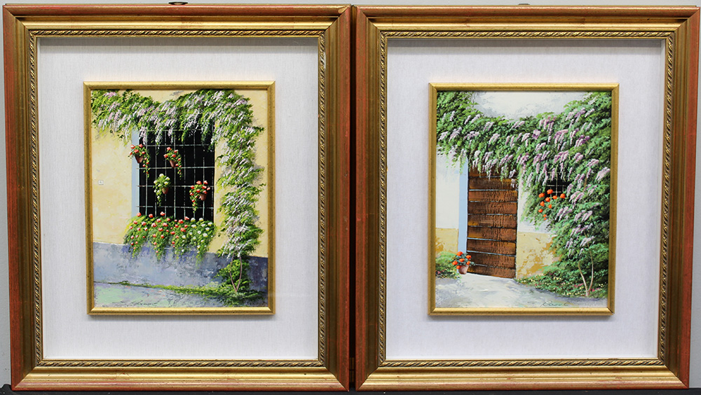 Lotto di quattro dipinti raffiguranti un vaso con fiori e scorci fioriti,...