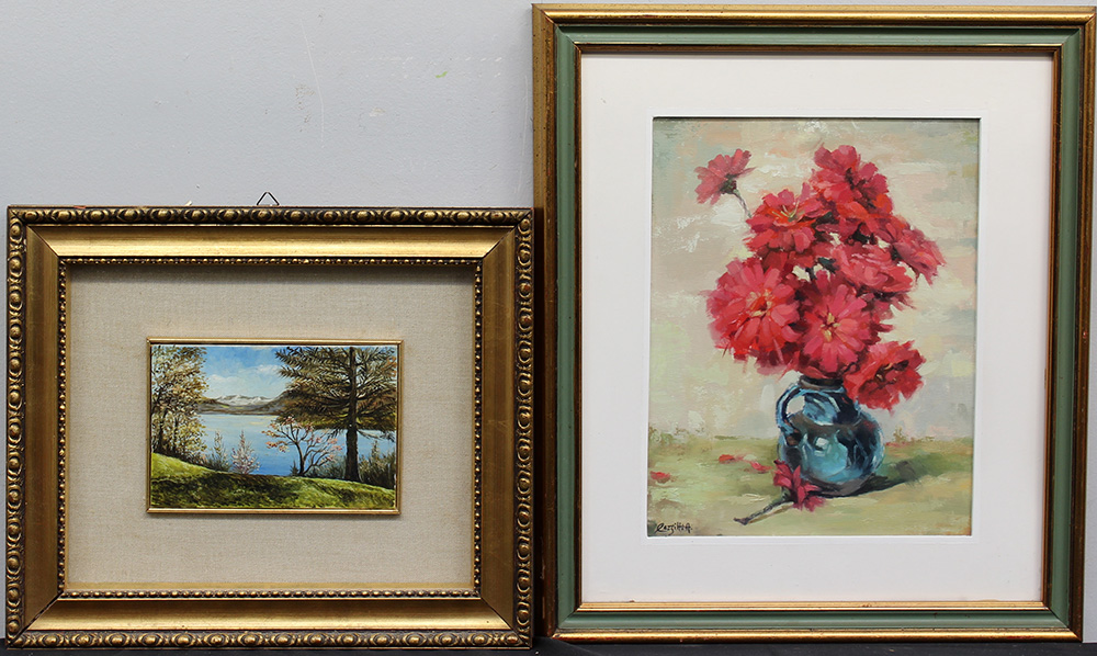 Lotto di quattro dipinti raffiguranti un vaso con fiori e scorci fioriti, autori e misure diverse. In cornici
