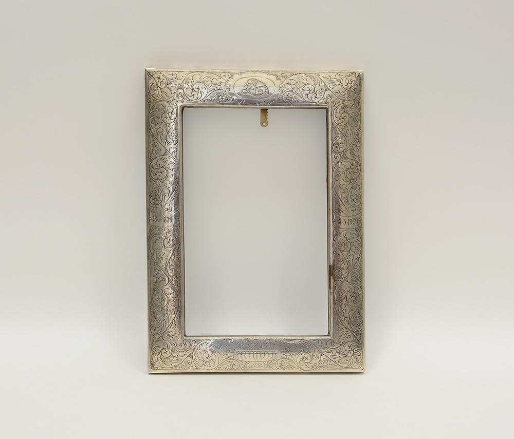Cornice portafoto in argento con supporto in legno decorata a motivi...