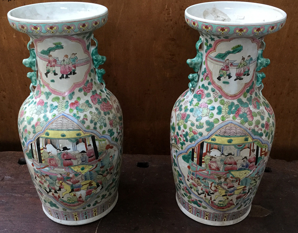 Coppia di vasi in porcellana Famiglia Rosa decorati con scene di palazzo e motivi floreali (difetti)