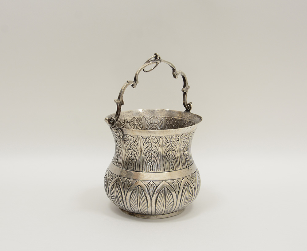 Secchiello in argento di forma circolare decorato con fasce di foglie lanceolate e di acanto, manico a volute con attacchi a volto muliebre. Manifattura italiana del secolo XX (h. secchiello cm 15, d. cm 16) (g 900 ca.) (lievi difetti)