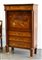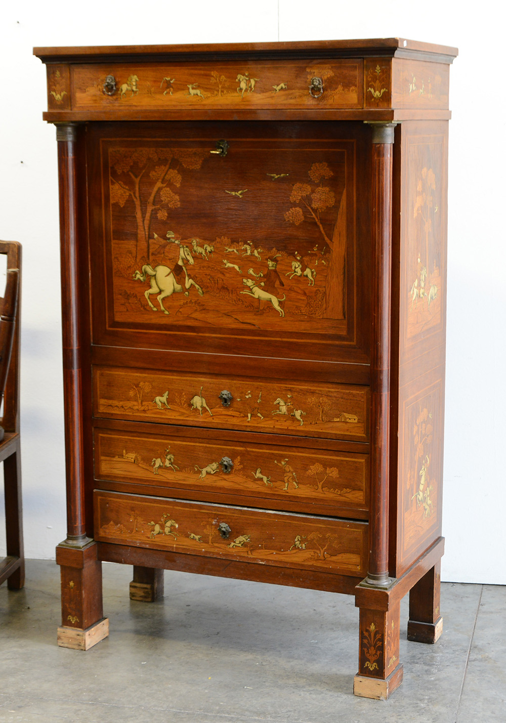 Mobile bar a quattro cassetti e anta ribaltabile interamente filettato in legno chiaro ed intarsiato in legni vari e avoriolina con scena di caccia (cm 95x192x48)(difetti)