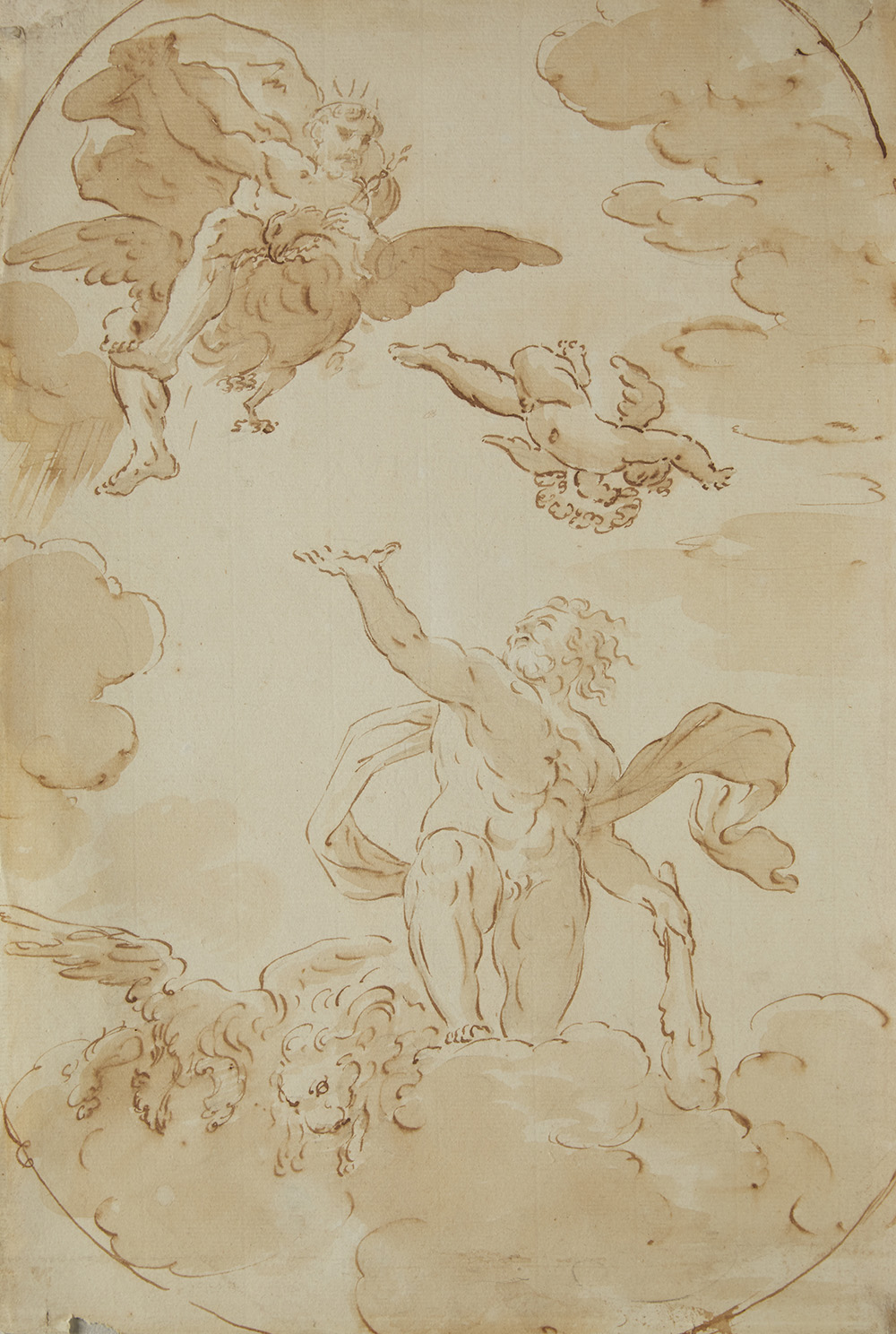 Artista del secolo XVII "Ercole e Giove" penna e inchiostro bruno, acquarellato in bruno e tracce di matita su carta applicata su un supporto di carta (mm 345x235) (difetti)
