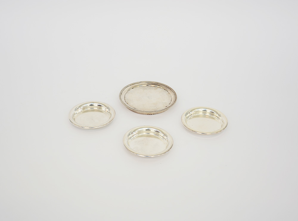 Lotto composto da tre sottobicchieri e un sottobottiglia in metallo argentato