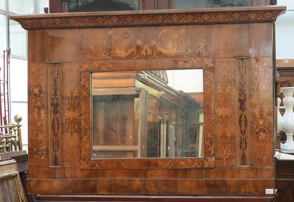 Caminiera con cornice lastronata in noce e intarsiata a volute e motivi geometrici stilizzati. (cm 143x94) (difetti)