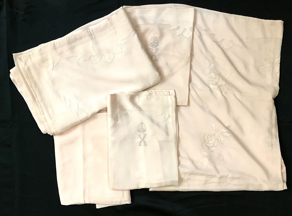 Completo per letto singolo in seta rosa, decorato con applicazioni floreali in tinta (lievi difetti)
