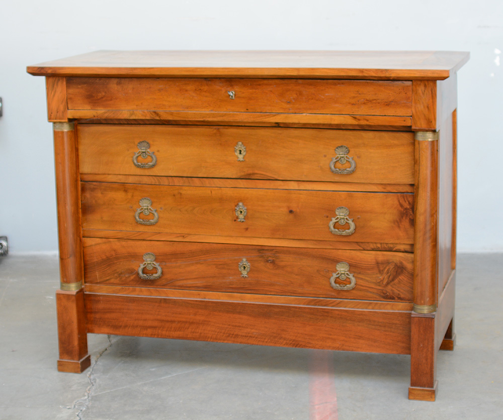 Comò "impero" in noce ad un cassetto sottopiano e tre grandi sul fronte. Montanti decorati con colonne e piedi a pilastro (cm 125x95x57) (difetti)