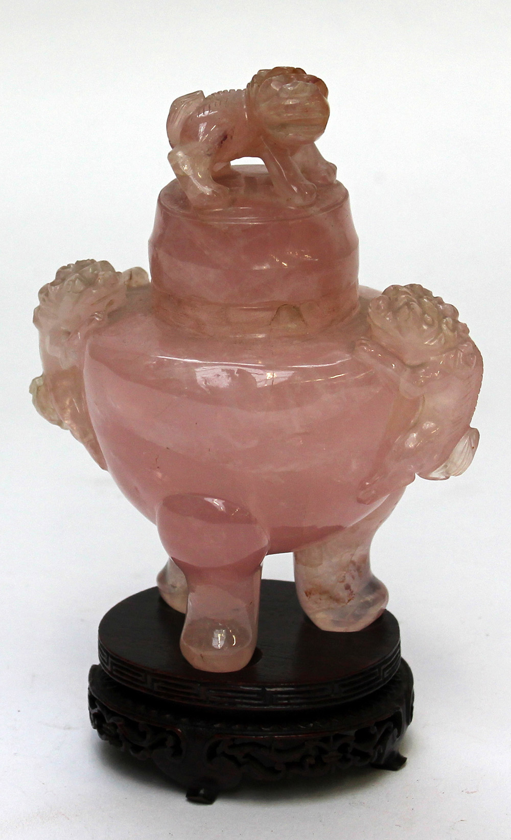 Incensiere tripode con coperchio in quarzo rosa, base in legno (h. max cm 16) (difetti)