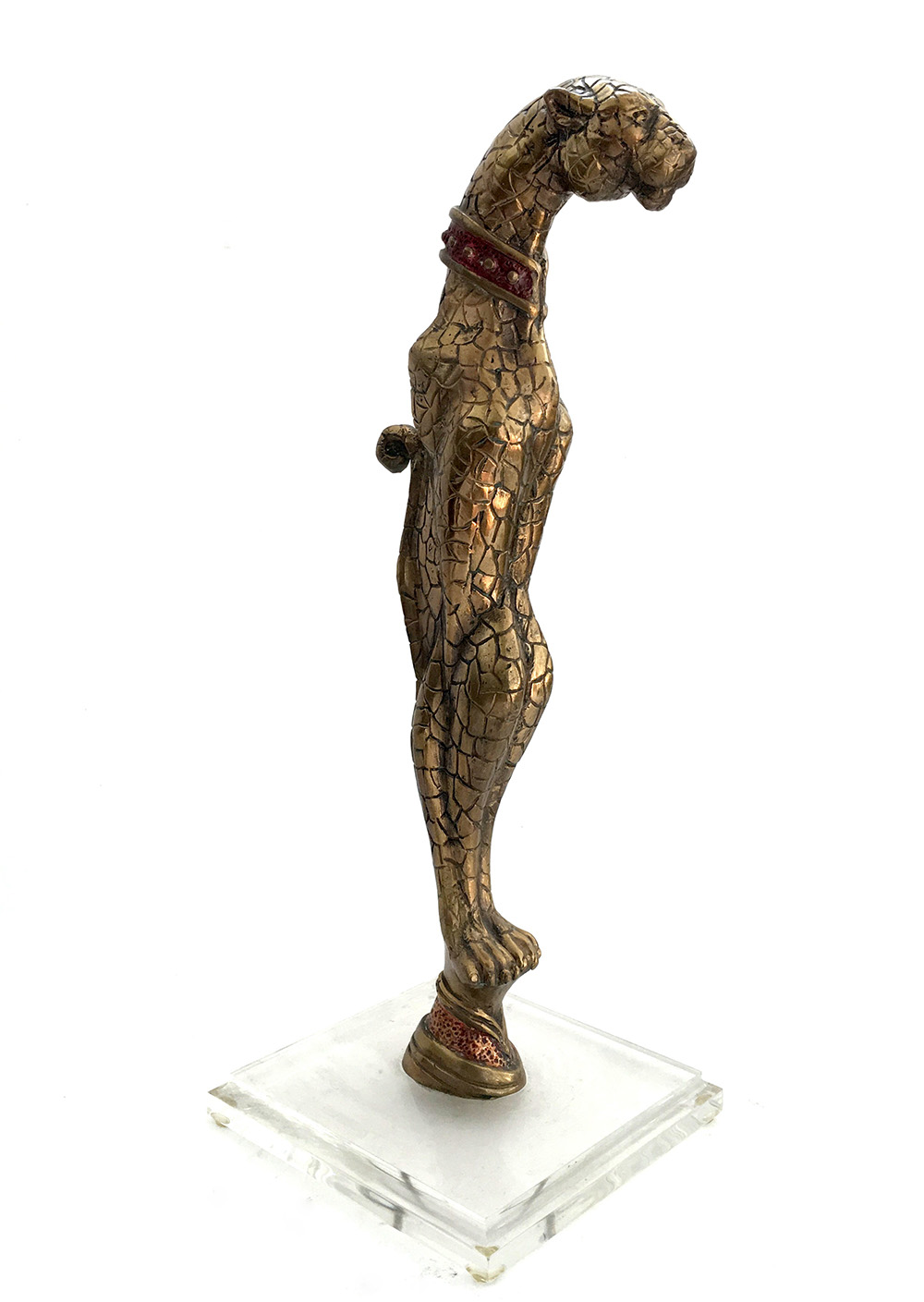 Scultura in bronzo raffigurante leopardo (h cm 43,5) poggiante su base in plexiglass (lievi difetti)