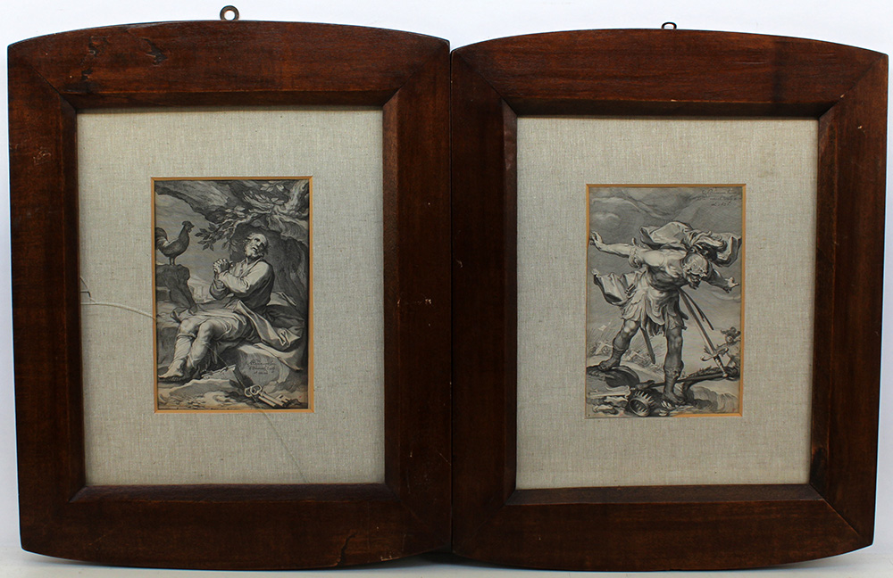 Coppia di incisioni su rame raffiguranti "La morte di re Seul" e "San Pietro" (cm 25x17) in cornice (smarginate)