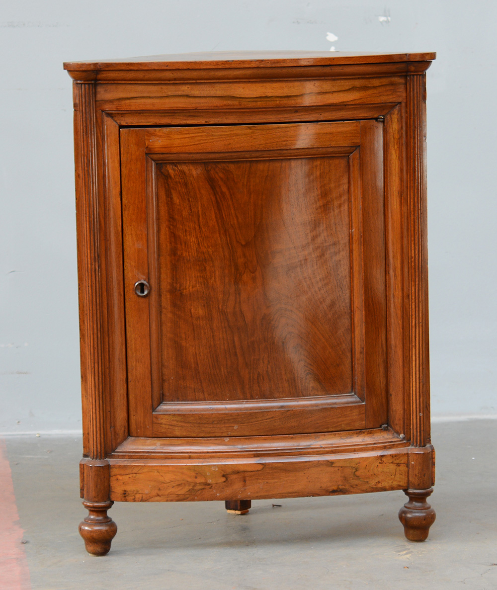 Angoliera in noce con fronte lievemente convessa, sportello incorniciato e piedi a cipolla. Secolo XIX (cm 67x89x43) (difetti)