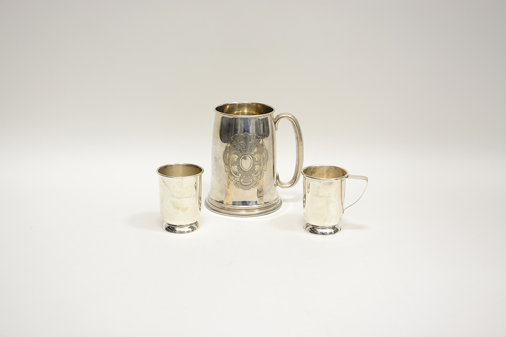 Lotto composto da un tankard e due piccoli bicchieri in argento (g 400 ca.)