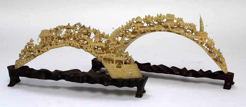 Due zanne in avorio intagliato con basi in legno. Cina, inizio secolo XX (lungh. max cm 31)