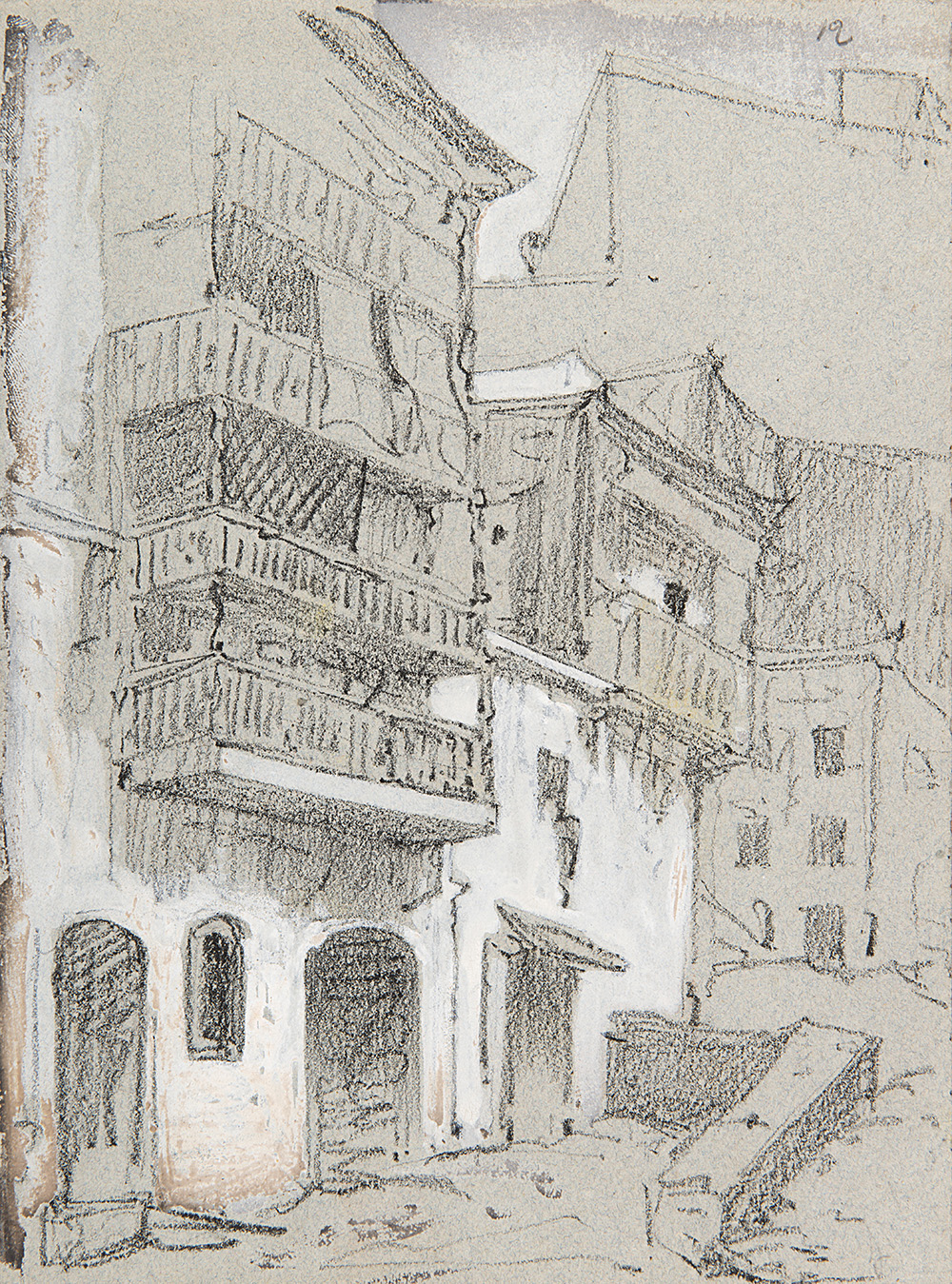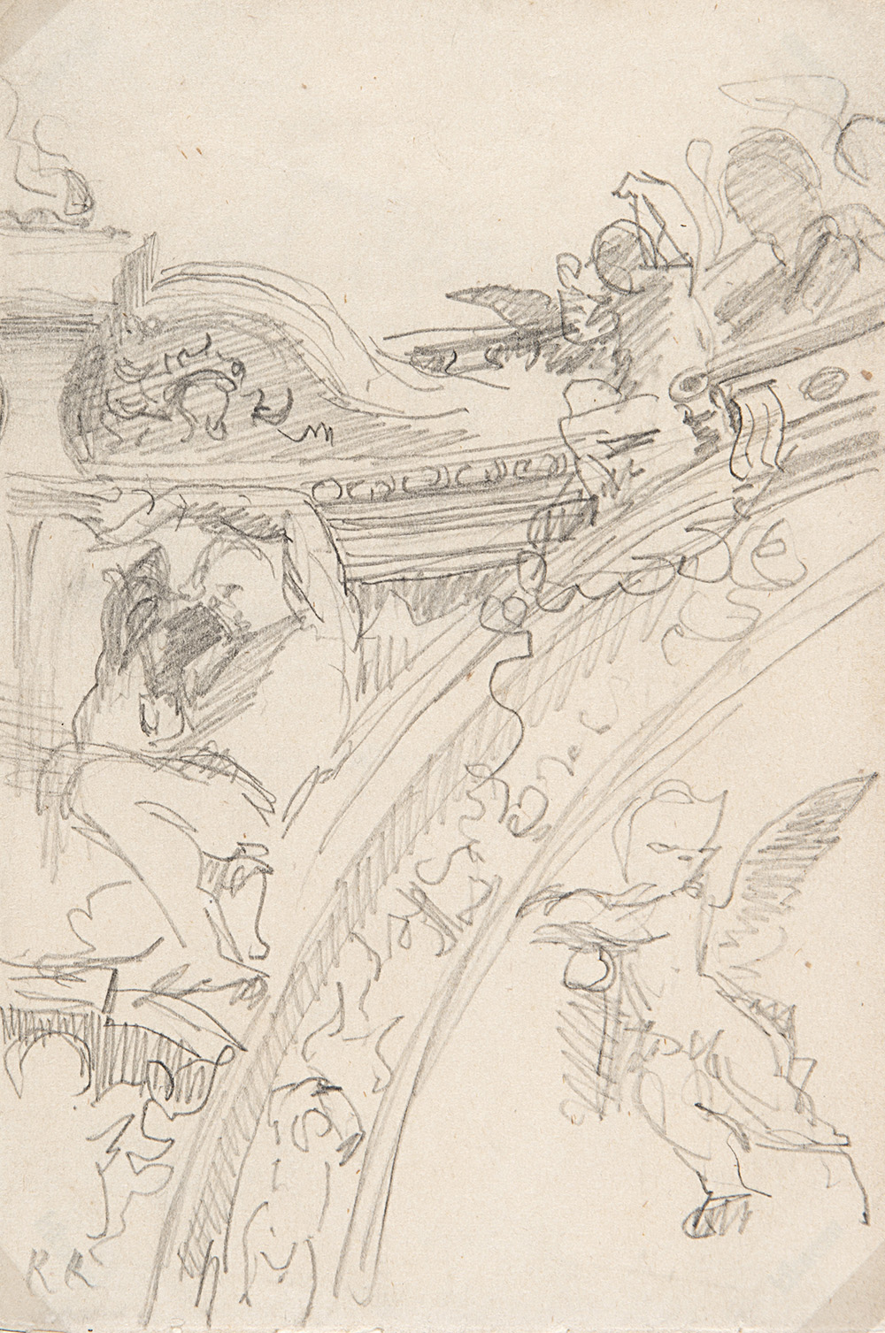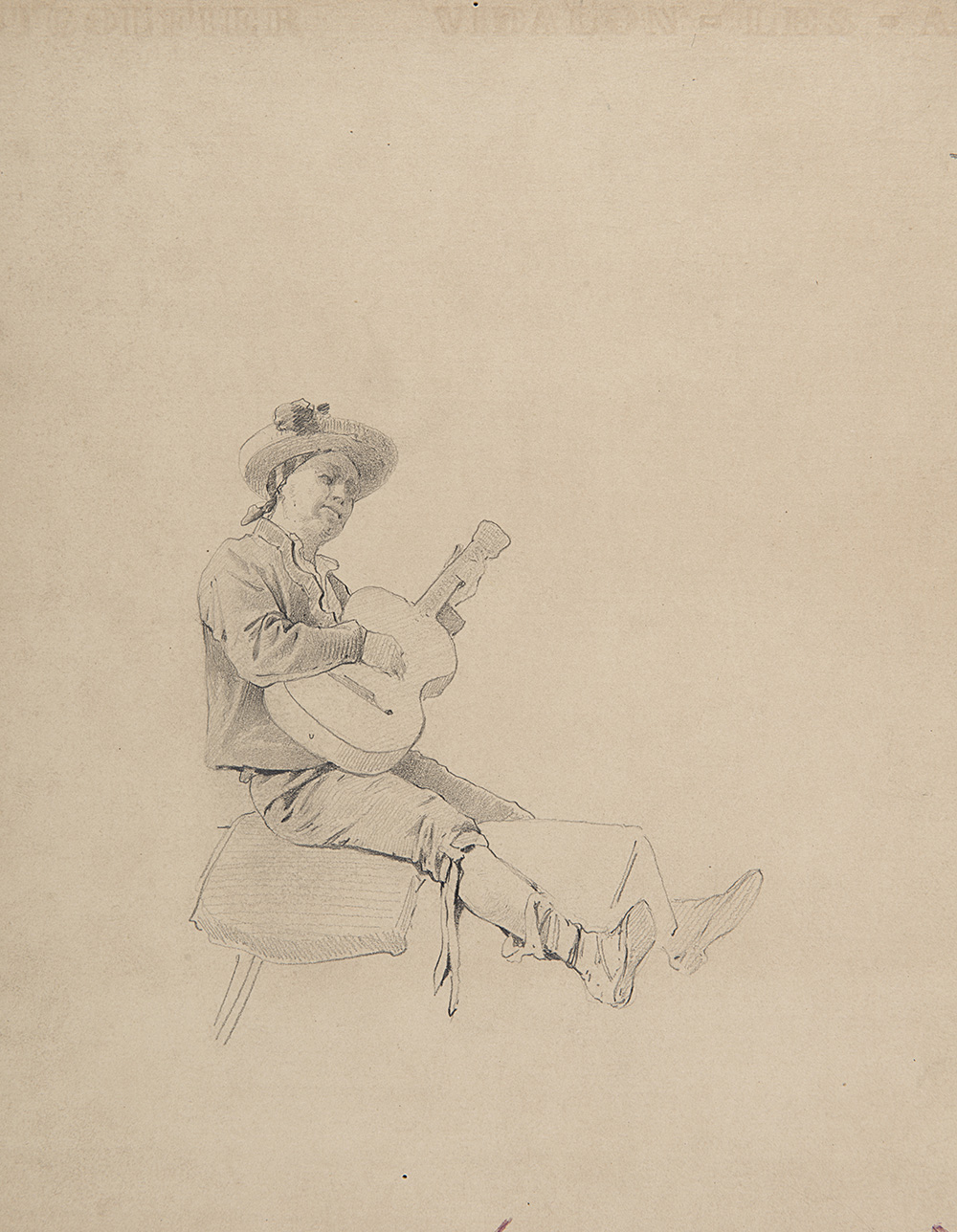 Lotto composto da tre disegni di artisti diversi del secolo XIX raffiguranti "Studio di decorazione architettonica" "Uomo che suona la chitarra" e "Veduta di paese", misure diverse (difetti)