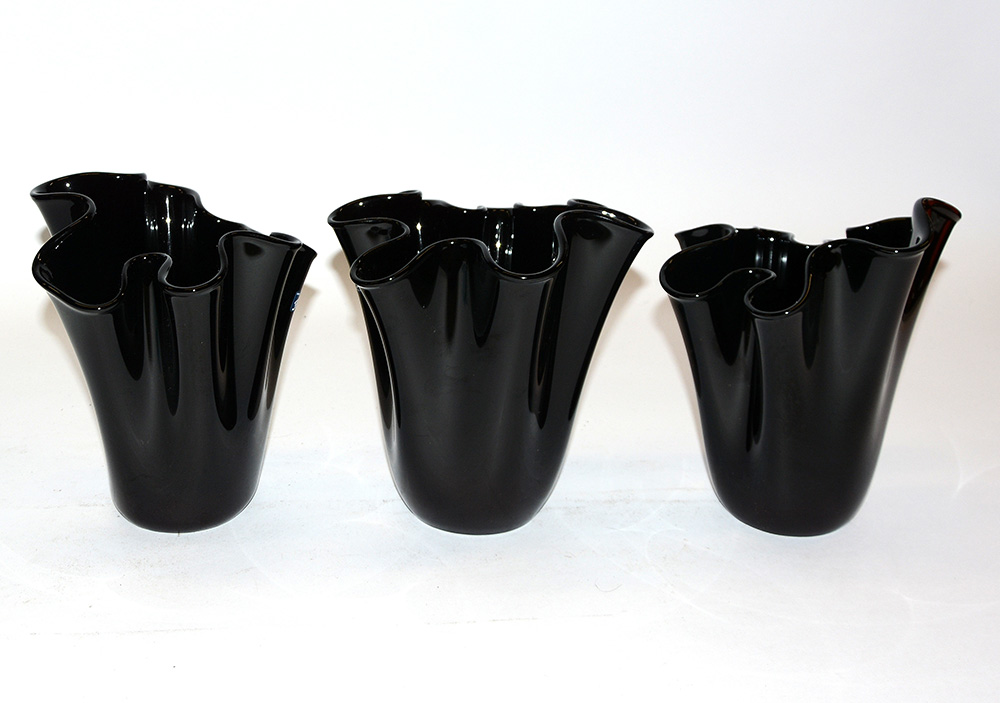Lotto composto da tre vasi a fazzoletto in vetro opacizzato nero (h max cm 22)