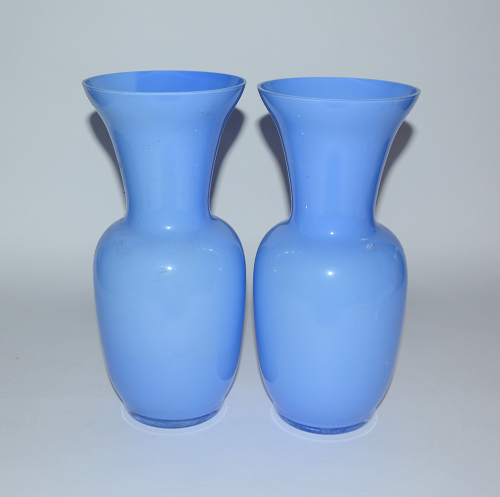 Lotto composto da due vasi a balaustra in vetro opacizzato celeste (h cm 35)