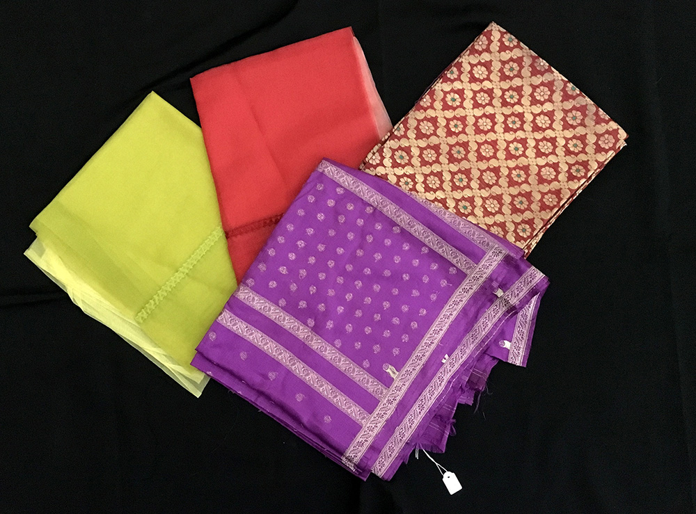 Lotto composto da quattro scialli di cui due stole in seta grezza nei colori del rosso e del verde acido e due sahri indiani in seta broccati in argento e oro. Misure diverse (lievi difetti)