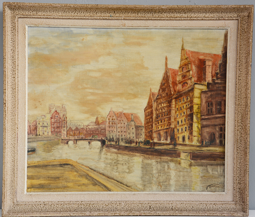 "Veduta della città di Gand" 1959. Olio su cartone telato (cm 52x66) firmato e datato in basso a destra, in cornice (difetti)