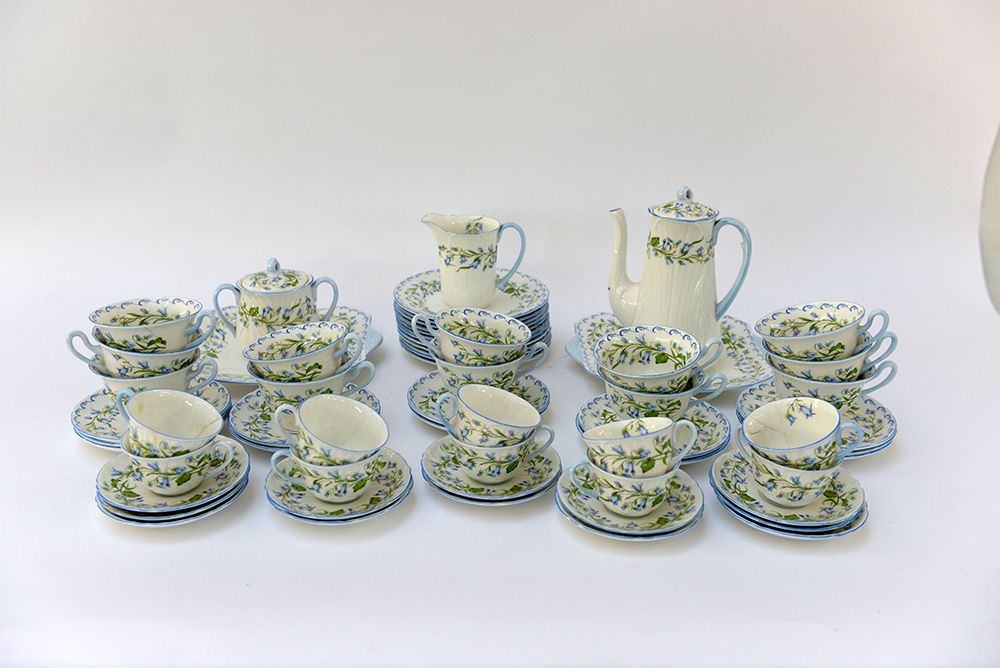 Manifattura Shelley. Parte di servizio da tè e caffè in porcellana decorato in policromia a campanule composto da tazzine da tè e caffè, teiera, lattiera e zuccheriera, due vassoietti e piatti da dolce (difetti)