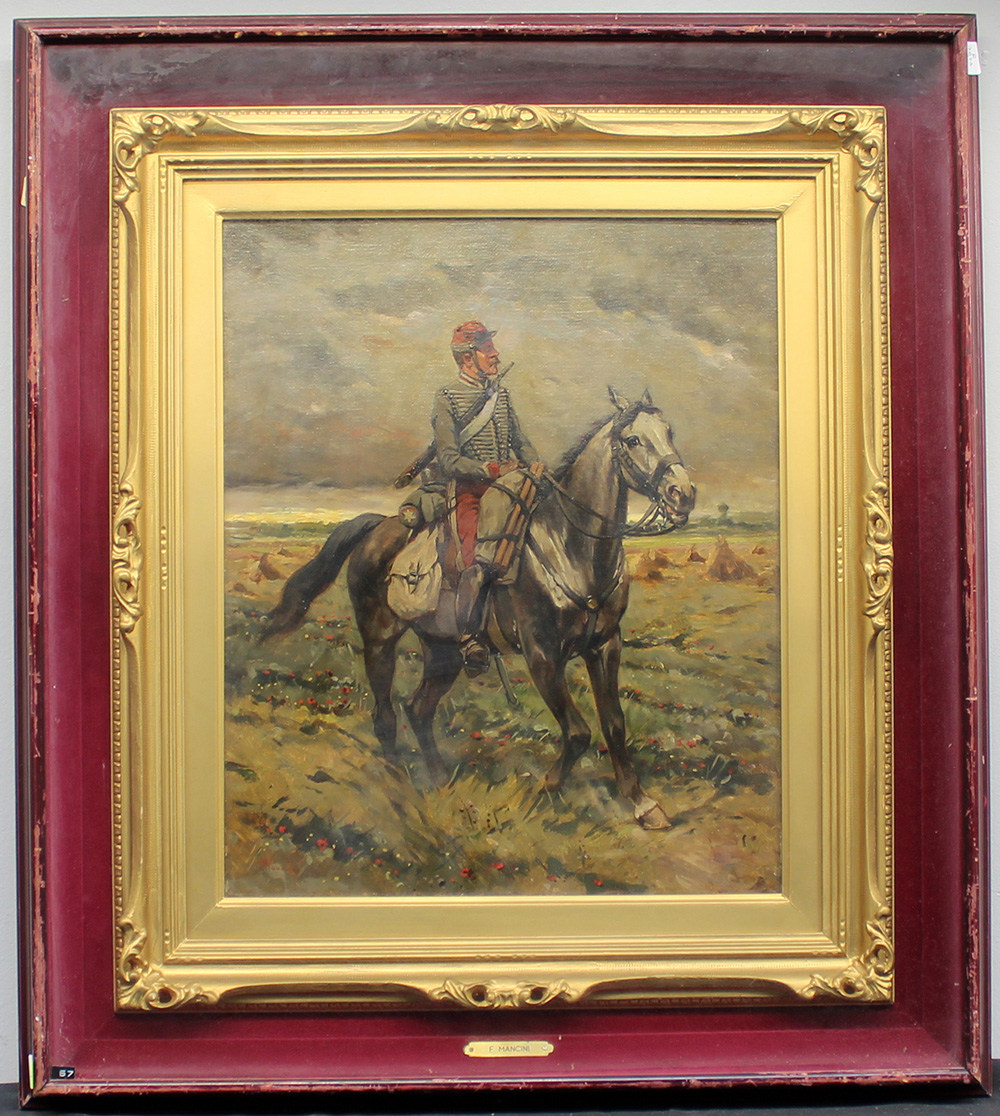 Lot 594 | F. Mancini "Soldato a cavallo" olio su tela (cm 46x38) Reca firma in basso a...